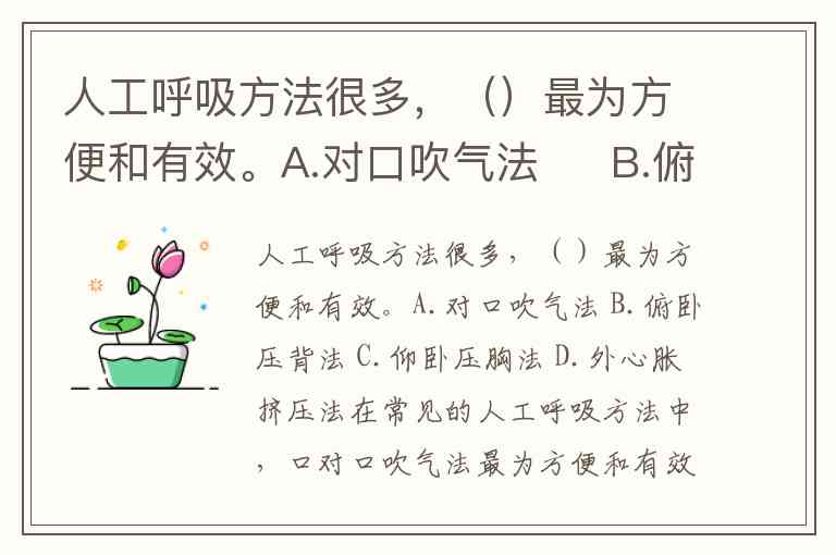 人工呼吸方法很多,()最为方便和有效。A.对口吹气法 B.俯卧压背法 C.仰卧压胸法 D.外心胀挤压法