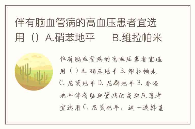 伴有脑血管病的高血压患者宜选用()A.硝苯地平 B.维拉帕米 C.尼莫地平 D.尼群地平 E.非洛地平