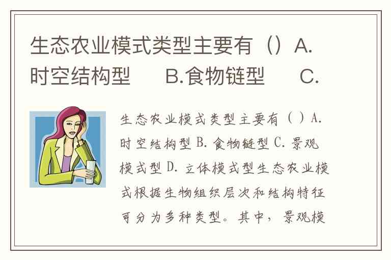 生态农业模式类型主要有()A.时空结构型 B.食物链型 C.景观模式型 D.立体模式型
