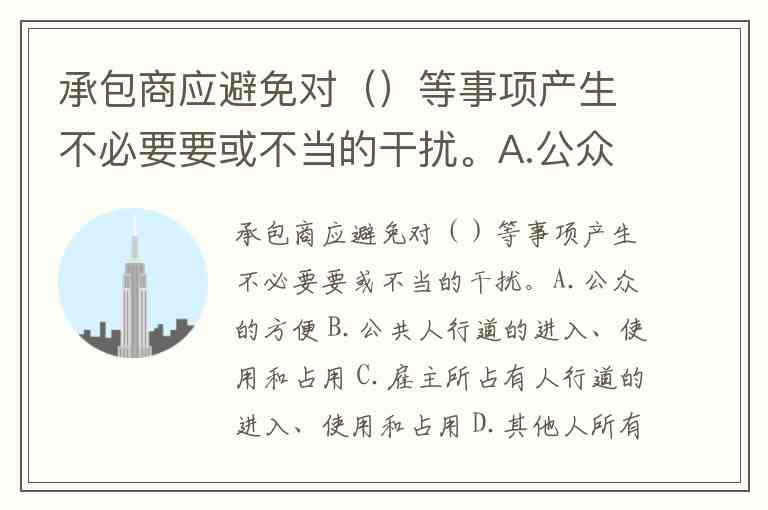 承包商应避免对()等事项产生不必要要或不当的干扰。A.公众的方便 B.公共人行道的进入、使用和占用 C.雇主所占有人行道的进入、使用和占用 D.其他人所有人行道的进入、使用和占用 E.分包商的现场施工