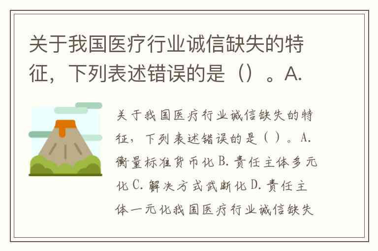 关于我国医疗行业诚信缺失的特征,下列表述错误的是()。A.衡量标准货币化 B.责任主体多元化 C.解决方式武断化 D.责任主体一元化