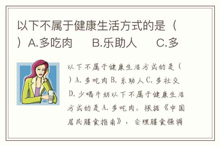 以下不属于健康生活方式的是()A.多吃肉 B.乐助人 C.多社交 D.少喝牛奶