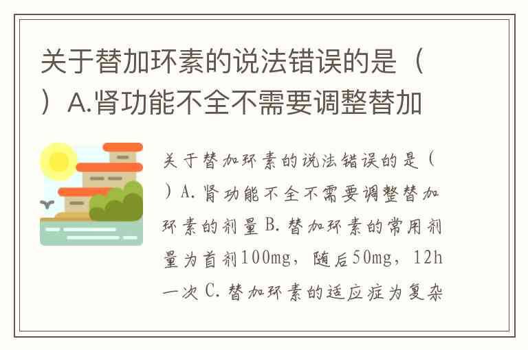 关于替加环素的说法错误的是()A.肾功能不全不需要调整替加环素的剂量 B.替加环素的常用剂量为首剂100mg,随后50mg,12h一次 C.替加环素的适应症为复杂性腹腔内感染、复杂性皮肤和皮肤软组织感染、社区获得性肺炎 D.替加环素属于特殊级抗菌药物,所以常用于治疗菌血症、颅内感染等重症感染