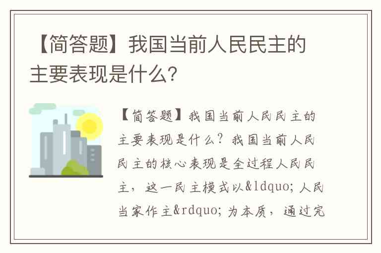 我国当前人民民主的核心表现是全过程人民民主,这一民主模式以“人民当家作主”为本质,通过完整的制度程序和参与实践,实现了过程民主与成果民主、程序民主与实质民主的统一,体现为“最广泛、最真实、最管用”的鲜明特征。