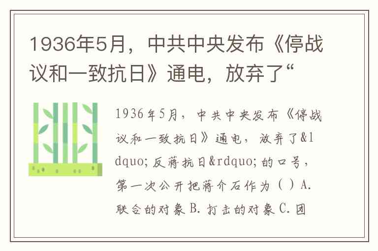 1936年5月,中共中央发布《停战议和一致抗日》通电,放弃了“反蒋抗日”的口号,第一次公开把蒋介石作为()A.联合的对象 B.打击的对象 C.团结的对象 D.斗争的对象