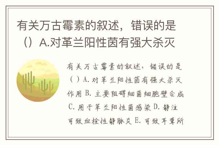 有关万古霉素的叙述,错误的是()A.对革兰阳性茵有强大杀灭作用 B.主要阻碍细菌细胞壁合成 C.用于革兰阳性菌感染 D.静注可致血栓性静脉炎 E.可致耳聋