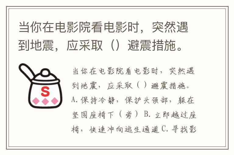 当你在电影院看电影时,突然遇到地震,应采取()避震措施。A.保持冷静,保护头颈部,躲在坚固座椅下(旁) B.立即越过座椅,快速冲向逃生通道 C.寻找影院管理人员,问问看该怎么做 D.冲向食品柜台取食品