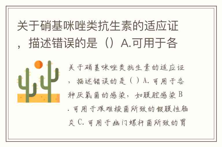 关于硝基咪唑类抗生素的适应证,描述错误的是()A.可用于各种厌氧菌的感染,如膜腔感染 B.可用于艰难梭菌所致的假膜性肠炎 C.可用于幽门螺杆菌所致的胃窦炎 D.可用于加德纳菌阴道炎 E.对寄生虫病无效