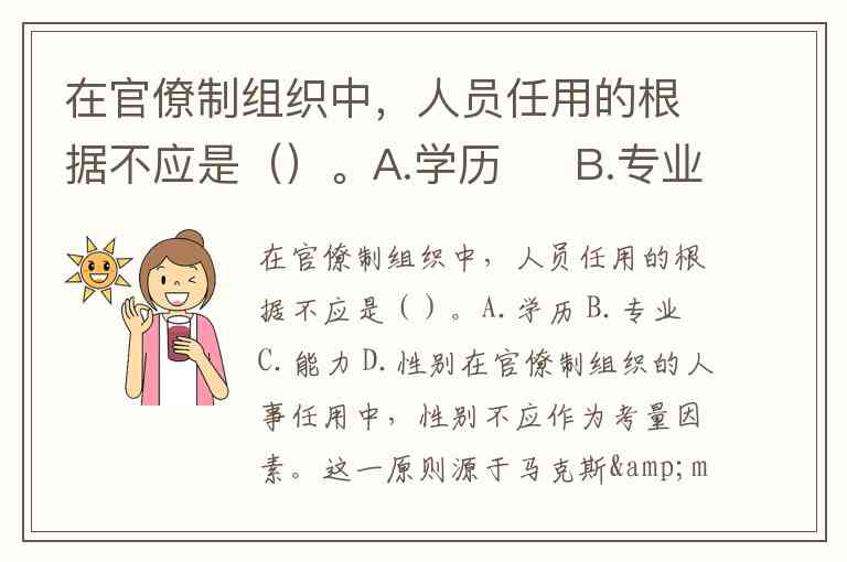 学历、专业和能力作为任用依据具有内在合理性。学历反映知识储备基础,专业代表领域适配性,能力则直接关联履职效能,三者共同构成官僚制“专职专人”的技术理性基础。例如,税务会计师的专业资质、交响乐团乐手的演奏能力,都是岗位匹配的核心标准。而性别差异与履职能力之间不存在逻辑关联,将其纳入任用考量会破坏组织的客观公正性,正如期末复习题的标准答案所明确指出的,性别是唯一不应作为任用根据的选项。