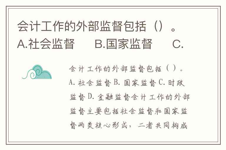 需要注意的是,选项中的“时政监督”并非会计监督体系的规范术语,而“金融监督”通常属于国家监督中的特定领域(如人民银行对金融机构的监管),并非独立的外部监督类型。这种分类体系体现了“政府监管+社会鉴证”的双重外部约束逻辑,既确保国家财经法规的刚性执行,又通过市场中介力量提升财务信息透明度。