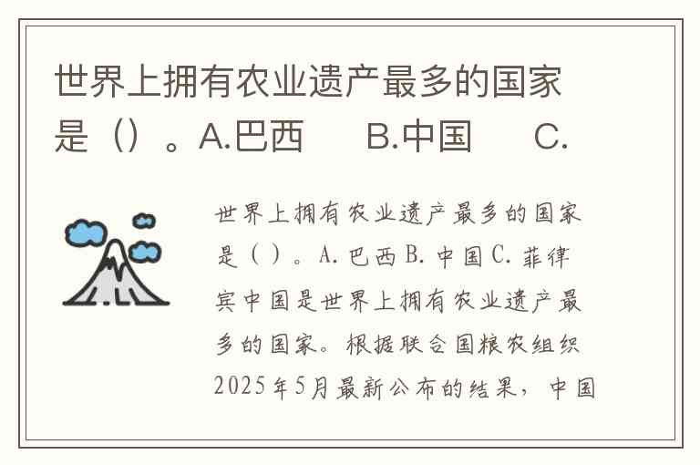 世界上拥有农业遗产最多的国家是()。A.巴西 B.中国 C.菲律宾