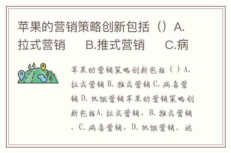 苹果的营销策略创新包括A.拉式营销、B.推式营销、C.病毒营销、D.饥饿营销。这些策略相互配合,形成了苹果独特的市场渗透模式。