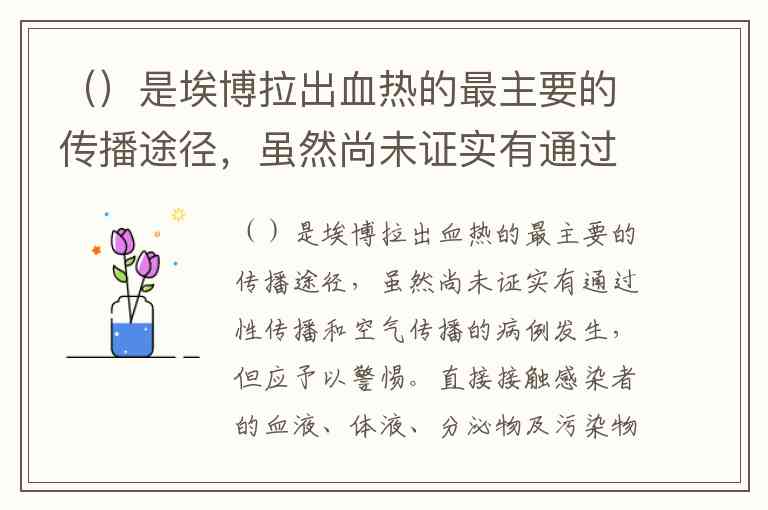 ()是埃博拉出血热的最主要的传播途径,虽然尚未证实有通过性传播和空气传播的病例发生,但应予以警惕。