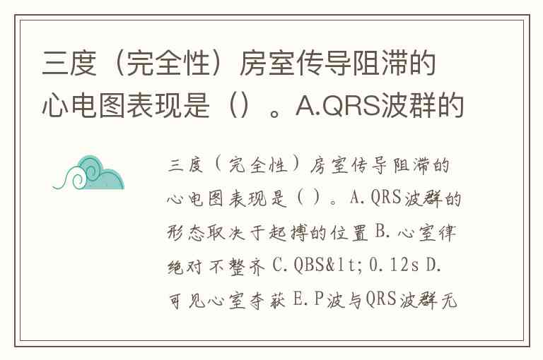E正确:P波与QRS波群完全无关且心房率快于心室率是诊断金标准。