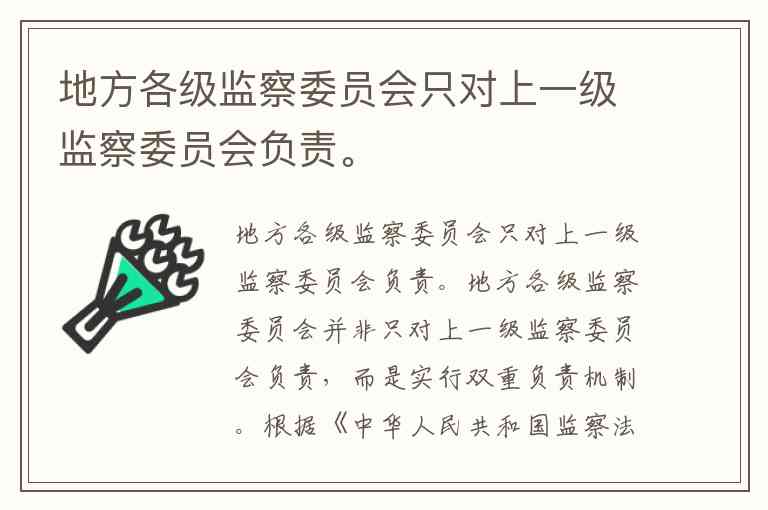 地方各级监察委员会并非只对上一级监察委员会负责,而是实行双重负责机制。根据《中华人民共和国监察法》第九条明确规定,地方各级监察委员会"对本级人民代表大会及其常务委员会和上一级监察委员会负责,并接受其监督"。这一制度设计体现了我国监察体制的鲜明特色,既坚持了人民代表大会制度这一根本政治制度,又强化了监察系统的垂直领导。