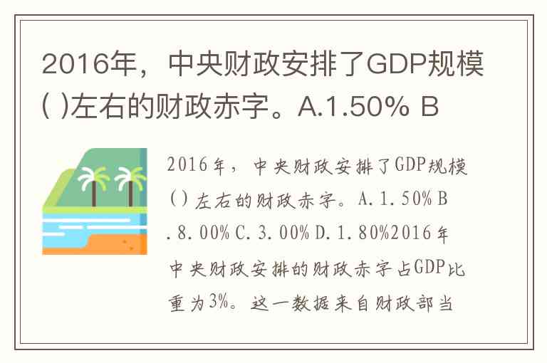 2016年,中央财政安排了GDP规模( )左右的财政赤字。A.1.50% B.8.00% C.3.00% D.1.80%