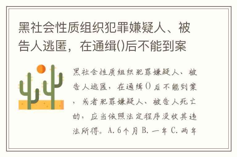 黑社会性质组织犯罪嫌疑人、被告人逃匿,在通缉()后不能到案,或者犯罪嫌疑人、被告人死亡的,应当依照法定程序没收其违法所得。A.6个月 B.一年 C.两年 D.三年