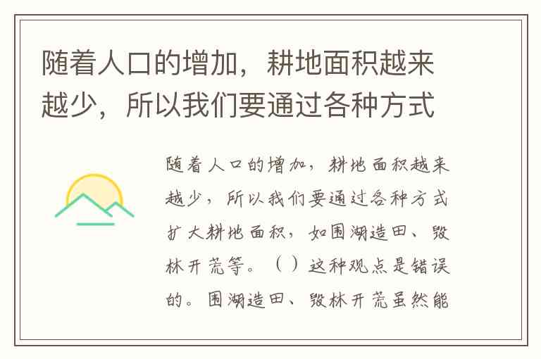 随着人口的增加,耕地面积越来越少,所以我们要通过各种方式扩大耕地面积,如围湖造田、毁林开荒等。()
