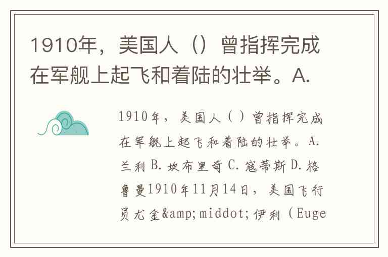 1910年,美国人()曾指挥完成在军舰上起飞和着陆的壮举。A.兰利 B.坎布里奇 C.寇蒂斯 D.格鲁曼