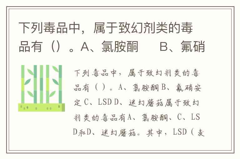 下列毒品中,属于致幻剂类的毒品有()。A、氯胺酮 B、氟硝安定 C、LSD D、迷幻蘑菇