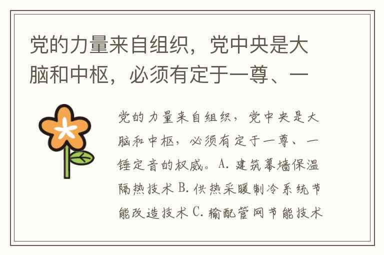 党的力量来自组织,党中央是大脑和中枢,必须有定于一尊、一锤定音的权威。A.建筑幕墙保温隔热技术 B.供热采暖制冷系统节能改造技术 C.输配管网节能技术 D.新型节能照明技术