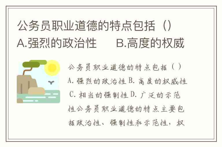 公务员职业道德的特点主要包括政治性、强制性和示范性,权威部门文件及学术研究均对此有明确阐述。