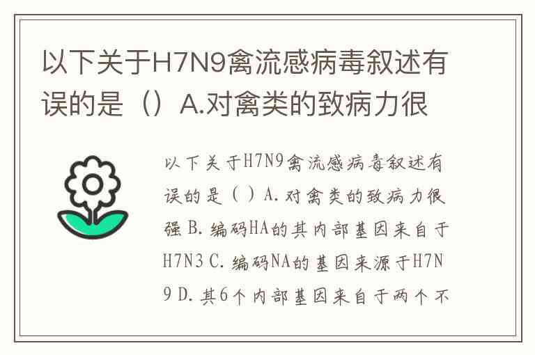 以下关于H7N9禽流感病毒叙述有误的是()A.对禽类的致病力很强 B.编码HA的其内部基因来自于H7N3 C.编码NA的基因来源于H7N9 D.其6个内部基因来自于两个不同源的H9N2禽流感病毒