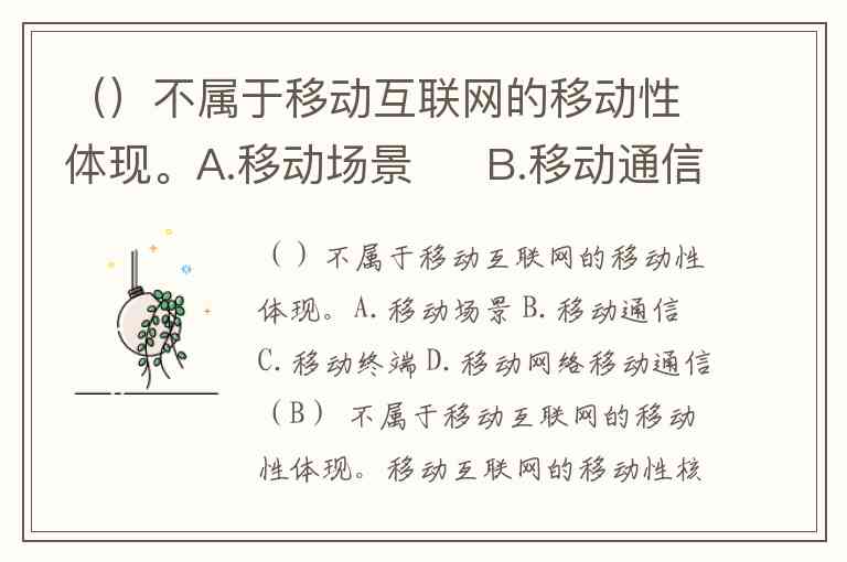 ()不属于移动互联网的移动性体现。A.移动场景 B.移动通信 C.移动终端 D.移动网络