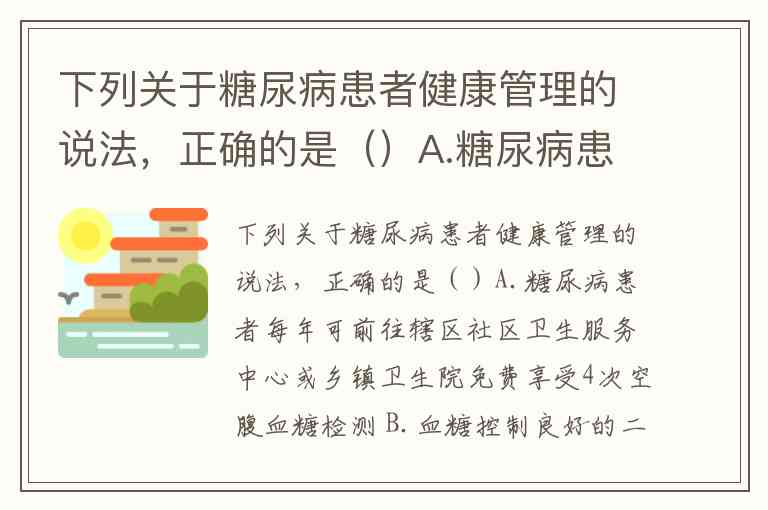 下列关于糖尿病患者健康管理的说法,正确的是()A.糖尿病患者每年可前往辖区社区卫生服务中心或乡镇卫生院免费享受4次空腹血糖检测 B.血糖控制良好的二型糖尿病患者每周监测血糖1-2天 C.血糖控制不好的二型糖尿病患者应每日监测血糖,直至血糖得到控制 D.糖尿病患者在剧烈运动前不需要增加监测次数