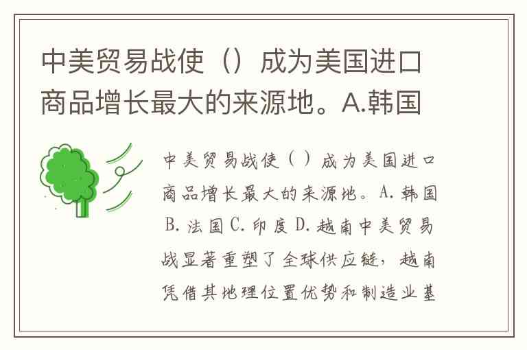 中美贸易战使()成为美国进口商品增长最大的来源地。A.韩国 B.法国 C.印度 D.越南