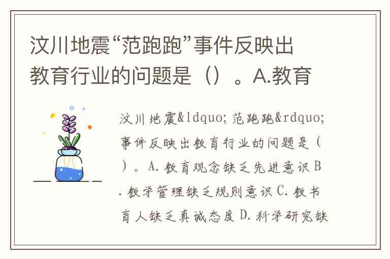 汶川地震“范跑跑”事件反映出教育行业的问题是()。A.教育观念缺乏先进意识 B.教学管理缺乏规则意识 C.教书育人缺乏真诚态度 D.科学研究缺乏诚信精神