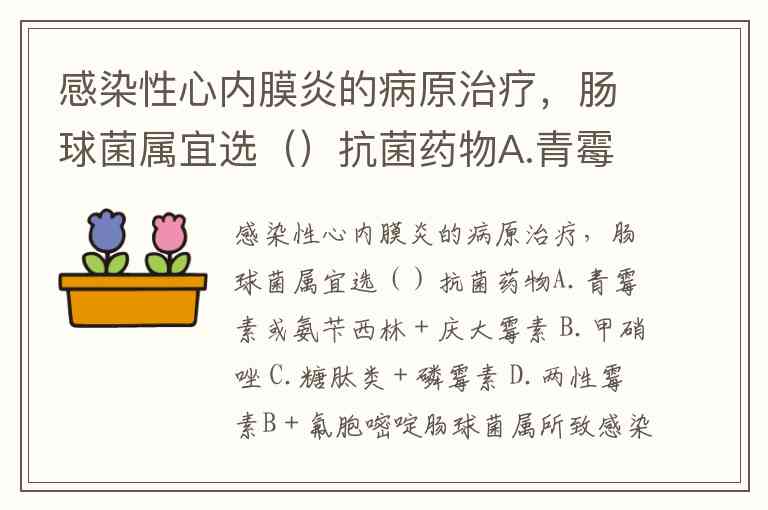 感染性心内膜炎的病原治疗,肠球菌属宜选()抗菌药物A.青霉素或氨苄西林+庆大霉素 B.甲硝唑 C.糖肽类+磷霉素 D.两性霉素B+氟胞嘧啶