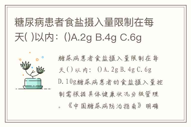 糖尿病患者食盐摄入量限制在每天( )以内:()A.2g B.4g C.6g D.10g