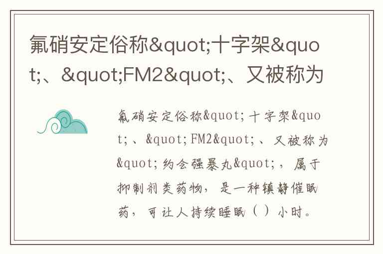 氟硝安定,俗称“十字架”“FM2”,又被称为“约会强暴丸”,属于苯二氮卓类抑制剂,具有显著的催眠和遗忘作用。其镇静催眠效果较强,能迅速诱导睡眠,持续时间通常为5-7小时。这一持续时长使其成为恶性犯罪的工具——受害者服用后会陷入意识模糊,失去反抗能力,且事后常因药物导致的记忆丧失而难以举证。