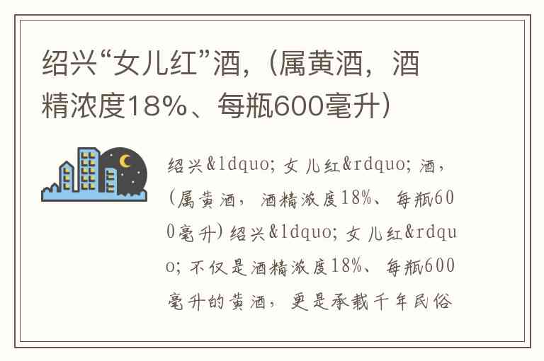 绍兴“女儿红”酒,(属黄酒,酒精浓度18%、每瓶600毫升)
