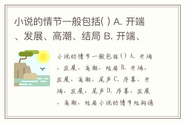 小说的情节一般包括( ) A. 开端、发展、高潮、结局 B. 开端、发展、高潮、尾声 C. 序幕、开端、发展、尾声 D. 序幕、发展、高潮、结局