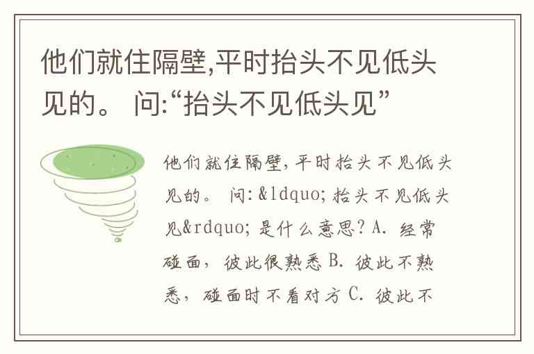 他们就住隔壁,平时抬头不见低头见的。 问:“抬头不见低头见”是什么意思? A. 经常碰面,彼此很熟悉 B. 彼此不熟悉,碰面时不看对方 C. 彼此不熟悉,碰面时候不打招呼 D. 无