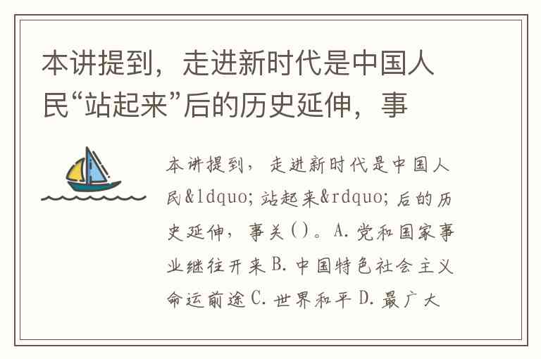 本讲提到,走进新时代是中国人民“站起来”后的历史延伸,事关( )。A.党和国家事业继往开来 B.中国特色社会主义命运前途 C.世界和平 D.最广大人民的根本利益 E.全球化进程
