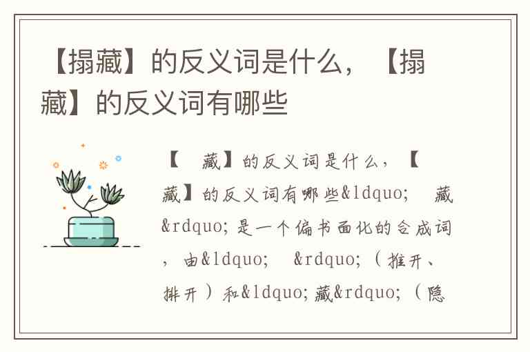 从语义逻辑看,其反义词应围绕“公开、显露、揭示”等相反动作展开。结合“藏”字系列反义词的语言习惯及文档依据,“暴露” 是最贴切的反义词——既包含“显露在外”的结果,也隐含“被动或主动公开”的过程,与“搨藏”的“主动隐藏”形成直接对立。