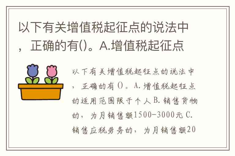 结论:只有选项A“增值税起征点的适用范围限于个人”符合现行规定。随着减税降费政策深化,起征点标准已远高于题目中所列旧数值,实际执行中需以最新法规为准。
