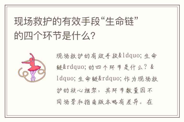 “生命链”作为现场救护的核心框架,其环节数量因不同场景和指南版本略有差异。在基础急救普及和传统教学中,最常被提及的是四个关键环节,包括早期通路(呼救)、早期心肺复苏、早期心脏除颤和早期高级生命支持。这些环节聚焦于心脏骤停发生后的黄金抢救时间,强调第一目击者与专业救援的无缝衔接。
