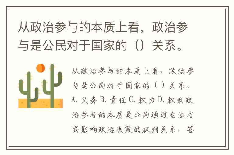 从政治参与的本质上看,政治参与是公民对于国家的()关系。A.义务 B.责任 C.权力 D.权利