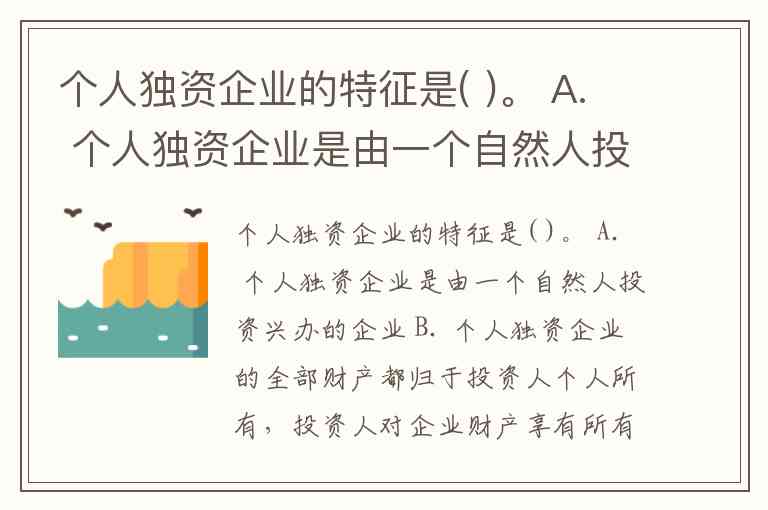 个人独资企业的核心特征可概括为“一个核心、三重属性”:以单一自然人投资为基础,兼具财产私有性、责任无限性和非法人属性。根据《个人独资企业法》及司法实践,正确选项为 A、B、C,具体分析如下: