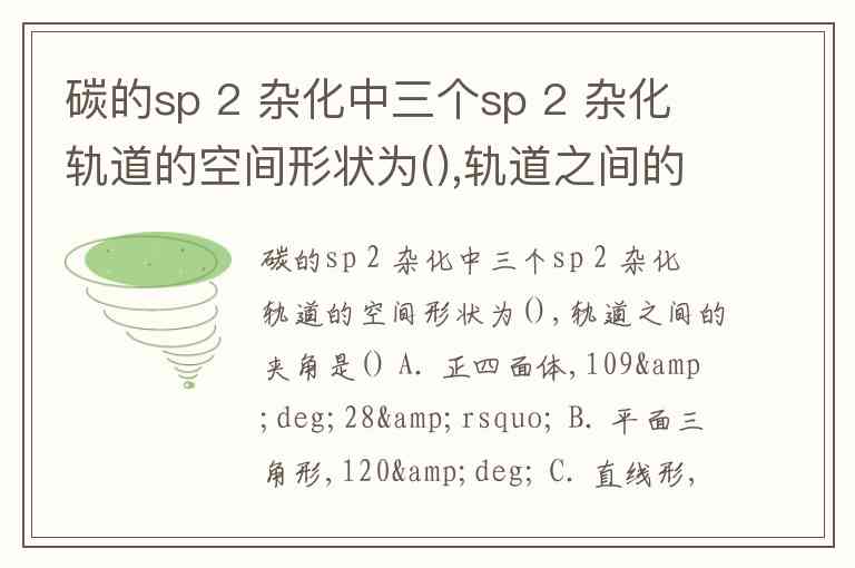 碳的sp 2 杂化中三个sp 2 杂化轨道的空间形状为(),轨道之间的夹角是() A. 正四面体,109°28’ B. 平面三角形,120° C. 直线形,180°
