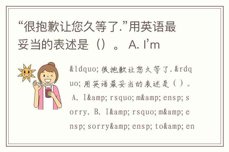 “很抱歉让您久等了.”用英语最妥当的表述是()。 A. I’m sorry. B. I’m sorry to have kept you waiting. C. I’m sorry to be kept waiting. D. Sorry to wait so long.