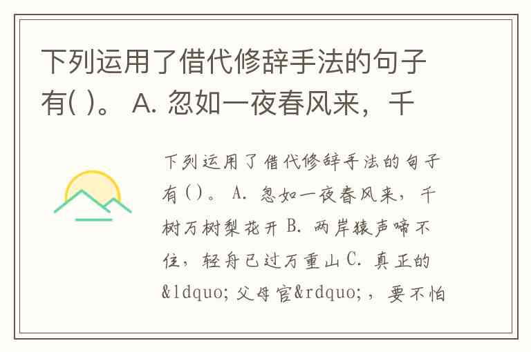 下列运用了借代修辞手法的句子有( )。 A. 忽如一夜春风来,千树万树梨花开 B. 两岸猿声啼不住,轻舟已过万重山 C. 真正的“父母官”,要不怕丢选票,不怕打黑枪 D. 各级政府一定要稳定“菜篮子”,管好“米袋子” E. 疏影横斜水清浅,暗香浮动月黄昏