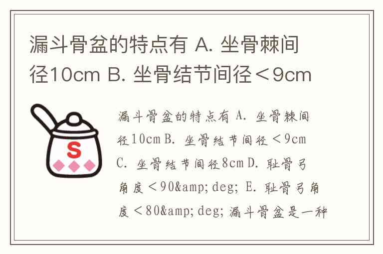 漏斗骨盆的特点有 A. 坐骨棘间径10cm B. 坐骨结节间径<9cm C. 坐骨结节间径8cm D. 耻骨弓角度<90° E. 耻骨弓角度<80°
