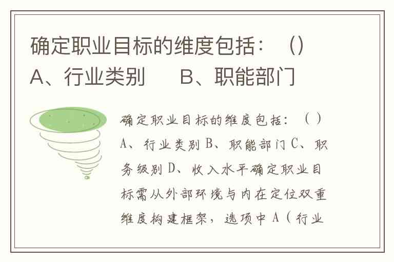 确定职业目标需从外部环境与内在定位双重维度构建框架,选项中 A(行业类别)、B(职能部门)、C(职务级别) 均为核心维度,而收入水平更多是目标实现后的结果而非设定维度本身。