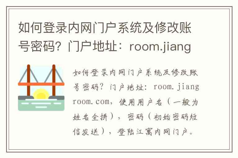 如何登录内网门户系统及修改账号密码?门户地址:room.jiangroom.com,使用用户名(一般为姓名全拼),密码(初始密码短信发送),登陆江寓内网门户。登录后可以在门户-个人中心-修改密码修改自己的密码,注意账号密码和江寓邮箱密码绑定,修改密码后邮箱密码也同时被修改。