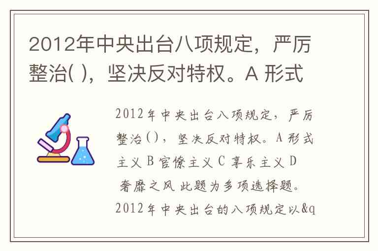 2012年中央出台八项规定,严厉整治( ),坚决反对特权。A 形式主义 B 官僚主义 C 享乐主义 D 奢靡之风 此题为多项选择题。